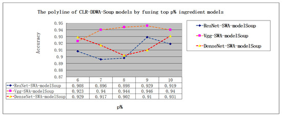The accuracy of the polyline representing CLR-DDWA-Soup, fusing the top p% ingredient models on the BreakHis dataset.