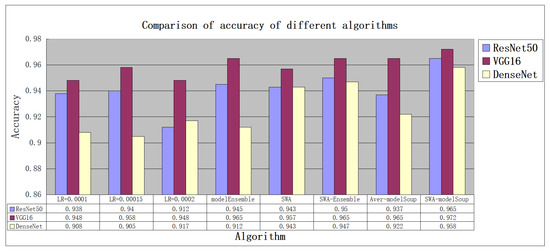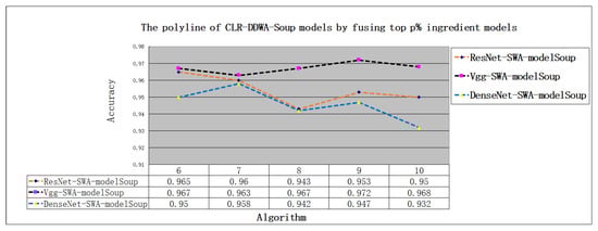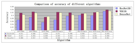 Figure 8 and Figure 9 show the accuracies of the SCAN and BreakHis datasets for ensemble and soup models based on different ingredient models, i.e., ResNet, VGG, and DenseNet. It can be seen that no single model can achieve the best classification performance in all ingredient models. For CLR-DDWA-Soup, the soup model based on VGG achieves the best performance. The reason may be that the features of the training images in the SCAN dataset are relatively salient and can be effectively extracted via a relatively standard convolutional neural network. In addition, the soup model based on ResNet and DenseNet demonstrates relatively close classification results, which are greatly improved compared to the standard SWA model and the three models with constant learning rates. The highest increase rate reached 8.78%.