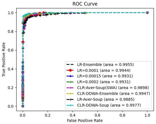 Figure 10 shows the receiver operating characteristic (ROC) curves of the models on the BreakHis dataset. It is a curve drawn according to a series of different two-classification methods (cut-off value or determination threshold), with the true positive rate (sensitivity) representing the ordinate and the false positive rate representing the abscissa. The ROC curve can easily determine the ability of a model to recognize samples at a certain threshold. We can see that CLR-DDWA-Soup achieves the largest area under the curve (AUC) among all methods. The larger the AUC, the higher the sensitivity; the lower the misclassification rate, the better the performance of the model.