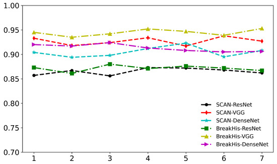 Table 6 shows the ranking of the models on both datasets in a Friedman test. There are three values in each cell, representing the average ranking of the method on the SCAN dataset, the average ranking on the BreakHis dataset, and the average ranking of the model on the two datasets. The last column is the total ranking, which is obtained by averaging the rankings on two datasets and three base models. In our study, and , meaning that the values do not meet the requirements of Equation (17). Therefore, it is necessary to look up the table to determine the value of p. Thus, we have . In the field of machine learning, we usually presuppose that ranges from to . Since the p-value is less than , we need to reject the original hypothesis, which suggests that there are significant differences in the performances among the I algorithms being compared across the datasets.