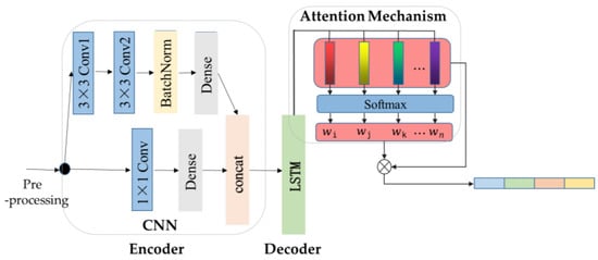 The encoder is formed by a CNN, such as Resnet [15], which adopts a residual structure to avoid over-fitting. Firstly, since the input contains the time dimension and the feature dimension, two continuous 3 × 3 convolution layers are applied to receive the input and capture feature. After that, it will come through a BatchNormalization (BN) layer, which is widely used to normalize the data to the same quantity and accelerate convergence; then, a Dense layer is used to accept the characteristics and reduce the dimensions, and at the same time, a 1 × 1 convolution layer is used to deliver useful information and concatenate the output of the Dense layer. The concatenated feature is flattened and passes through a Dense layer to reduce the dimensions. The output of the CNN module will be passed to a standard LSTM module as the input. The output of the LSTM module will predict the effluent wastewater quality through the attention mechanism.