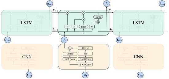 As shown in Figure 3, an encoder–decoder structure is adopted in the model that uses a CNN as an encoder and an LSTM as a decoder. The encoder is responsible for converting input into features and the decoder is responsible for converting features into targets.