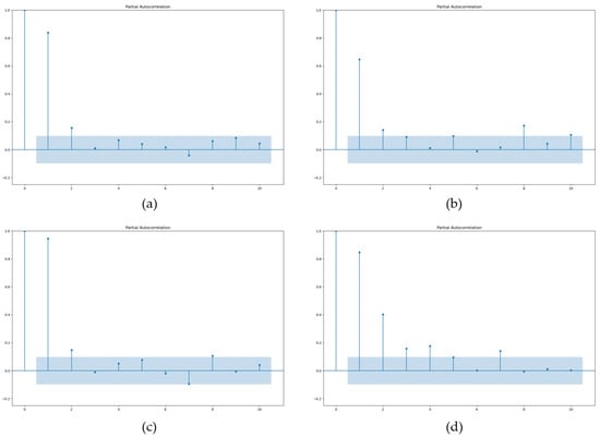 As stated in Section 3.2, WWTPs adopt a push-flow design to flow the wastewater, so the quality of the effluent wastewater at the adjacent sampling time should be highly correlated. As shown in Figure 4, we calculated the PACF (Partial Autocorrelation Function) for four effluent wastewater quality indicators.