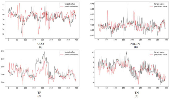 After the training was completed, the data in the test set were fed into the model for predicting the effluent wastewater quality at once. The predicted results are shown in Figure 6.