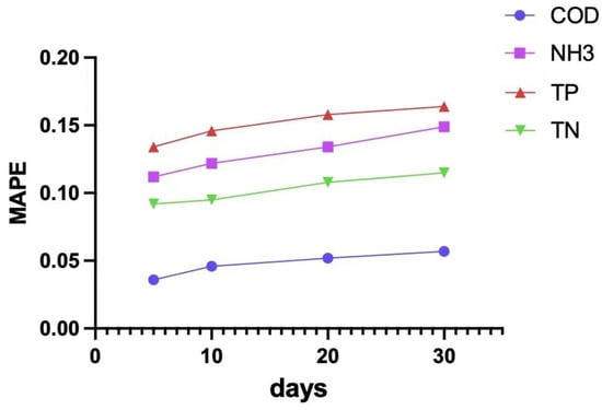 We calculated the MAPE value of the predicted results for 5 days, 10 days, 20 days and 30 days, as shown in Figure 7; it was found that the MAPE of all four wastewater quality indicators increases over time, which may be caused by changes in the wastewater quality conditions or the control methods of the WWTPs.