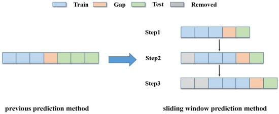 The previous prediction method predicted all the results at once, whereas the sliding window method, shown in Figure 8, breaks the process down into multiple steps. Each step only predicts the part of the test set adjacent to the training set. After completing the prediction, we slide back to proceed to the next step. Finally, the predicted results of each step are combined to obtain all of the predicted results.
