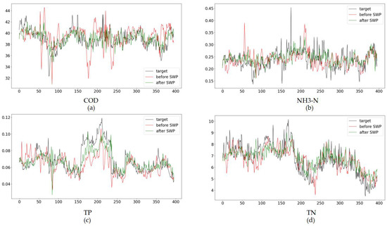 (a) The target and predicted values of COD before and after using SWP; (b) the target and predicted values of NH3-N before and after using SWP; (c) the target and predicted values of TP before and after using SWP; (d) the target and predicted value of TN before and after using SWP.