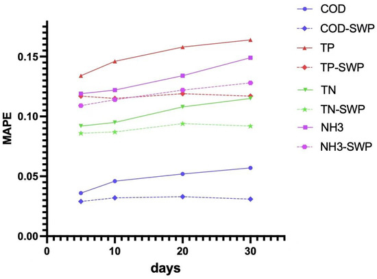 We also calculated the MAPE value of the predicted results for 5 days, 10 days, 20 days and 30 days, as shown in Figure 10. After using the SWP method, the prediction performance is improved in two aspects. On one hand, the accuracy of the prediction is improved, which means that for any effluent wastewater quality indicator, after using SWP, the MAPE value of the predicted result is decreased, showing that the model can achieve more accurate prediction with SWP. On the other hand, the stability of prediction is improved. In the absence of SWP, the MAPE value of the predicted results increases over time. After the sliding window is adopted, the MAPE values of the predicted results remain stable.