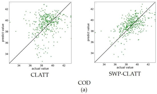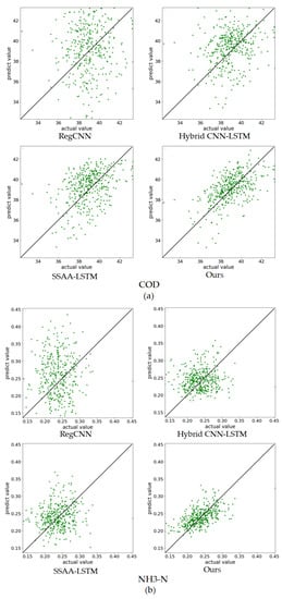 The SWP method can maintain stable prediction performance by constantly updating the parameters of the model, and can be used in any model of wastewater quality prediction based on neural network. In order to better compare different models, the SWP method was adopted in all subsequent experiments. Furthermore, in order to compare the predicted results of different methods more intuitively, we use the following point cloud map (PCM) to show the predicted results. The horizontal axis of the image represents the actual value, and the vertical axis represents the predicted value. The closer the point cloud on the image to the diagonal line, the more accurate the prediction results.