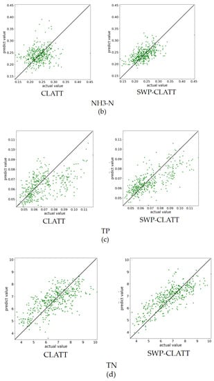 As can be seen from Figure 11, for the indicators COD and TP, there are a large number of discrete points with poor prediction effects on the edge of the point cloud map when SWP is not used for prediction. After SWP is used for prediction, the original discrete points on both sides of the slanted line move closer to the middle, while the point clouds converge toward the middle. For the indicators NH3 and TN, when SWP is not used, a small number of points are distributed on the edge. After SWP is used, it is difficult to find scattered points on the edge of the point cloud map.