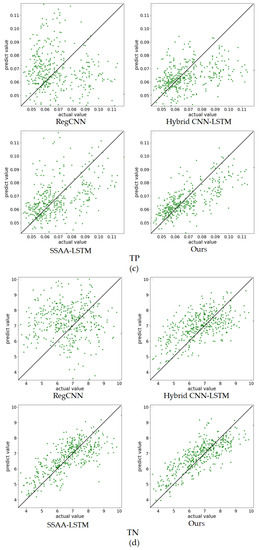 The horizontal axis of the picture represents the actual values, and the vertical axis represents the predicted values. The closer the distance between dots and slashes on the image, the more stable the prediction. As can be seen from the image, compared with the CNN method, the LSTM method has more advantages. Compared with the other methods, the point cloud map drawn using our method is denser and the predicted values are distributed near the actual values. In summary, our method achieves the optimal prediction performance and maintains the best stability.