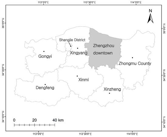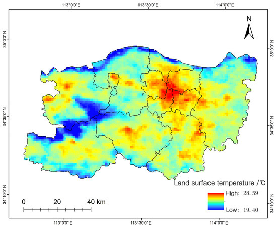 The value of ground surface temperature can be obtained using Equation (1). Administrative divisions separate the urban regions into districts, including Zhongyuan District, Erqi District, Guancheng District, Jinshui District, and Huiji District. The suburban areas include Zhongmu County, Xinzheng City, Xinmi City, Dengfeng City, Gongyi City, Xingyang City, and Shangjie District. The locations of administrative centers in the suburbs are indicated on the map by the black dots (see Figure 1).