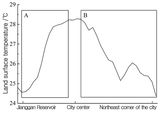 Temperature variation in urban and suburbs areas in Zhengzhou, where (A) is the variation in temperature in the southeast corner and (B) shows the variation in temperature in the northwest corner of Zhengzhou.