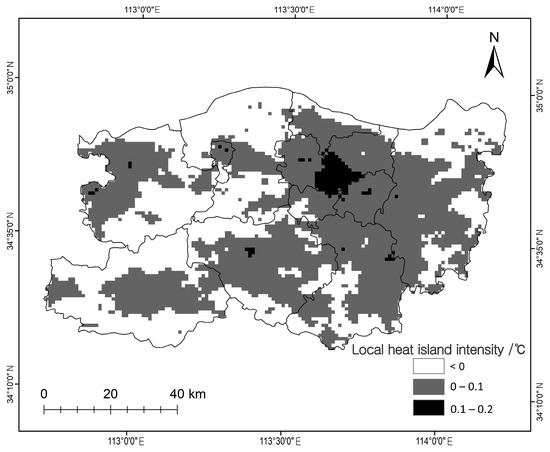 The LHII of Zhengzhou in 2021 was calculated to observe the spatial distribution characteristics of UHIs, and the results are shown in Figure 4. The results suggest that the Zhengzhou metropolitan area did not exhibit any significant hotspots or regions with elevated levels of UHI effect in 2021. The absence of strong UHI effects can be attributed to several factors, including the city’s relatively low population density, green spaces and water bodies, and effective urban planning and management practices. The findings of this study provide valuable insights into the dynamics of UHI effects in urban areas. They can inform the development of strategies for mitigating the adverse impacts of urbanization on the environment and human health. The depiction in Figure 2 illustrates the areas with a medium heat island effect, as indicated by the gray shading. Specifically, within the urban areas of Zhongmu County and Xinzheng City, there were numerous weak heat island areas, which were identified in several locations, including the western part of Gongyi City, the eastern part of Dengfeng City, the central part of Xinmi City, and the central and east parts of Xingyang City. These observations provide valuable scientific insights into the thermal behavior of these regions, which can inform further investigations into the underlying factors contributing to the observed patterns of UHIs.