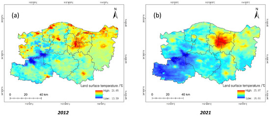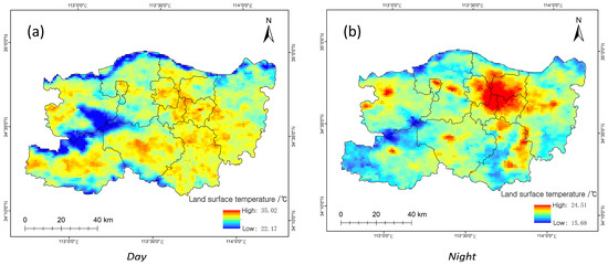 Spatial pattern of LST of Zhengzhou in 2021, where (a) shows the daytime and (b) shows the nighttime.