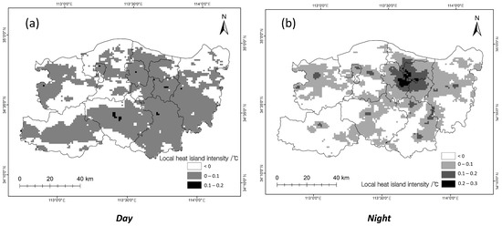 Local UHI effect of Zhengzhou City in 2021, with (a) representing the daytime UHI and (b) the nighttime UHI. The data highlight the spatial distribution of UHI intensity within the city, indicating regions with varying degrees of UHI effects.