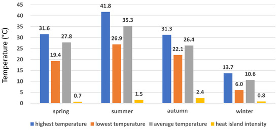 This study used three heat island indicators—ground surface temperature, heat island intensity, and local heat island intensity—to examine the heat island of a populated metropolis in four different ways: current status, day and night change, seasonal change, and year change. According to meteorology, there are four distinct seasons: spring (March–May), summer (June–August), autumn (September–November), and winter (December–February).
