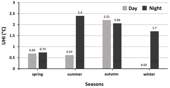 Interestingly, during the day, the heat island effect is stronger than the nighttime effect in autumn (2.21 °C). During the spring, summer, and winter, the nighttime heat island effect is stronger than the daytime effect. These findings emphasize the importance of season-specific mitigation strategies to address the heat island effect in urban environments.