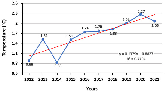 Our investigation revealed that the intensity of the heat island effect was highest during the autumn nighttime in Zhengzhou. The heat island effect during the autumn nighttime from 2012 to 2021 was examined as a representation of this phenomenon. Figure 9 demonstrates an overall increasing trend in the intensity of the heat island effect in Zhengzhou during this period. The power of the heat island effect was at its lowest point in 2014, with a temperature drop of 0.83 °C, whereas it reached its highest point in 2020, with a temperature rise of 2.27 °C. Although the intensity of the heat islands briefly increased in 2012 and 2013, it continued to decrease in 2014. These findings provide critical scientific insights into the temporal dynamics of heat islands in Zhengzhou, particularly concerning seasonal and yearly variations, which can inform future research efforts to understand the underlying causes and potential mitigative measures for UHIs.