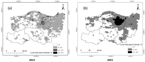 Nighttime comparison of surface temperature and local heat island intensity of autumn between (a) 2012 and (b) 2021.