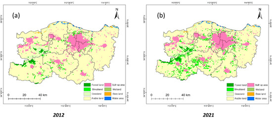 Spatial distribution of land use types in Zhengzhou, China, from (a) 2012 to (b) 2020. Data from 2021 were not available during the study. The figure shows the distribution of various land types, including forest land, shrubland, grassland, arable land, bare land, wetlands, water areas, and built-up areas. The spatial patterns of land use are associated with the distribution of UHIs, highlighting the impacts of urbanization on the urban climate.