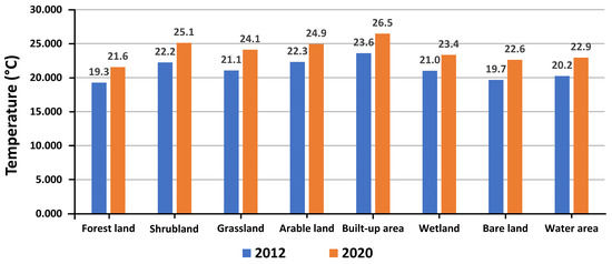 Temperature statistics of different land types in Zhengzhou from the years 2012 and 2020.