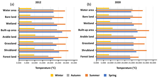 Statistical analysis of seasonal LST of different land types in Zhengzhou in (a) 2012 and (b) 2020.