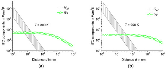 Figure 1. ITC components G n f ( d ) and G g ( d ) vs. distance d for flat surfaces in nitrogen gas at σ = 0.6, p = 105 Pa, and T = 300 K (a), as well as T = 900 K (b). The near-field component is estimated as G n f ( G n f m a x / 100 ,   G n f m a x / 10 ) .