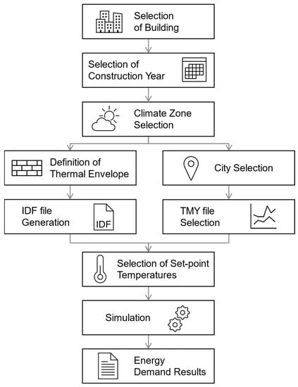This work, using a different approach, considered six geometries (three multifamily buildings and three single-family buildings), five thermal envelopes, and two construction years, resulting in a total of sixty building models. In addition, full coverage of all nine Köppen–Geiger climates of the Spanish peninsular region was guaranteed by considering a typical meteorological year (TMY) for each municipality, 8034 in total. For the heating and cooling, four and six values, respectively, for the static set-point temperature were considered. Combining all the variables, we obtained a total of 96,408 cases to simulate. To perform this massive simulation, we developed a VBA Excel® script that was able to generate an IDF file according to the building model and their location, run a simulation on EnergyPlus for each temperature set-point, and save the results. Figure 1 schematises the simulation procedure considered.