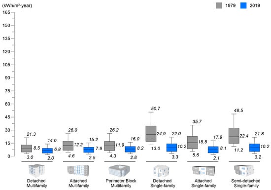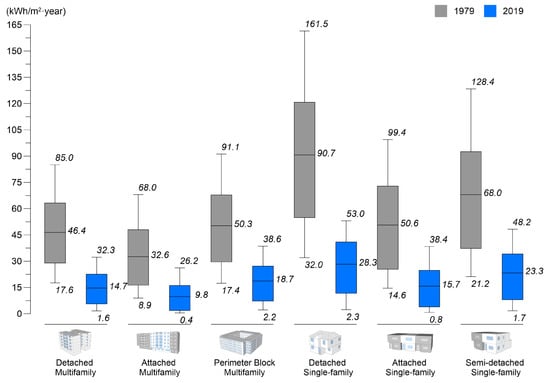 In Figure 2, we can observe with detail the expected heating demand range for the Spanish reference buildings, as well as the wide range of heating demand values of 1979 buildings compared with the latest buildings. This highlights the impact of improving the thermal envelope and the importance of incentivising building renovation, especially in a scenario where less than 2% [] of the existing buildings were constructed under Directive 2010/31/EU, and 55% of Spanish buildings were built prior to the 1979 Building Technical Code [].