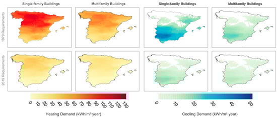 Figure 4 presents a map of the average demand for heating and cooling per building typology and construction year for the reference set-point temperatures; locations with a C1, D1, or E1 climate were excluded from the data analysis of cooling demand because the moments in which the indoor temperature was above 25 °C occurred in 5% or less of the building occupation period during the cooling season. This figure demonstrates the validity of the developed methodology and suggests the possibility of replicating this study in other countries by adjusting the sample of reference buildings, the indoor reference conditions, and the climates or locations to suit the context of each country.
