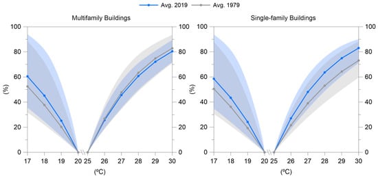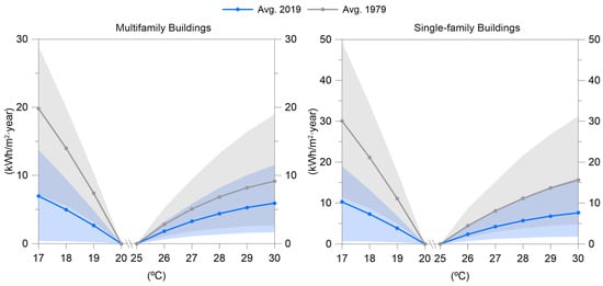 Figure 5 answers the question of how much energy is saved by extending the set-point temperature. This figure presents the average value of savings and the variation range, in kWh/m2/year, for each building typology and construction year. From the figure, it is highlighted that decreasing the set-point temperature by 1 °C during the winter season had more impact on the demand than increasing the set-point temperature by 1 °C during the summer season. At an average level and for single-family buildings, for example, 1.5 and 6.6 kWh/m2/year were the additional savings generated on the heating side, in comparison with the cooling savings for the 2019 and 1979 scenarios, respectively. Additionally, a higher savings potential in the oldest building stock was observed. Comparing the buildings of 1979 with the newest ones, we saw energy savings for heating demand of 2.8 to 2.9 times higher, and savings for cooling of 1.5 to 2.0 times higher, on average, indicating that the savings potential was lower on buildings that were adequately insulated.
