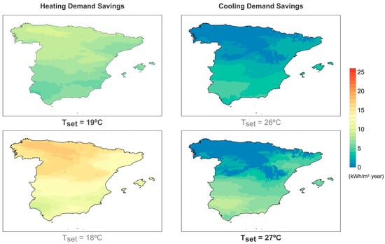Evaluating the savings potential as a percentage (Figure 7), we have a slightly different overview, especially because the percentages of savings were very similar between the construction years and building typology. This similarity is more evident by analysis of the variation of the average savings percentage across peninsular Spain (Appendix B). The justification for that lies in the fact that the building models were exposed to the same outdoor and indoor conditions. However, Figure 7 shows that we can expect, on average, a demand reduction of 20% by lowering the heating set-point by 1 °C and a demand reduction of 25% by raising the cooling set-point by 1 °C. In addition, going to extreme set-point temperatures for heating or cooling, a huge reduction was obtained, and for some locations, that reduction could reach easily values above 90%.