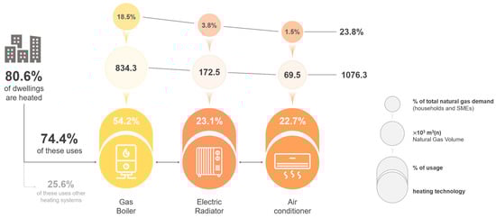 The objective of Figure 8 is to point out the expected impact of changing our homes’ thermostats by 1 °C, highlighting the 1076.3 thousand normal cubic meters of natural gas that could be saved. This value represents 23.8% of households and SMEs’ total natural gas demand in peninsular Spain in 2022. Hypothetically, if considering the same usage percentage of the typical heating systems and that all Spanish dwellings use one of them, the natural gas saving could reach up to 1.8 million normal cubic meters, representing almost 40% of the gas demand of households in 2022. However, quantifying this with an accurate number is difficult due to the diversity of heating systems, their efficiency, and the possibility of having more than one heating system in a dwelling. In addition, predicting the occupant’s behaviour is a difficult task, especially in dwellings where the decision to turn on the heating system relies on economic factors and the thermal comfort perceived by each occupant.