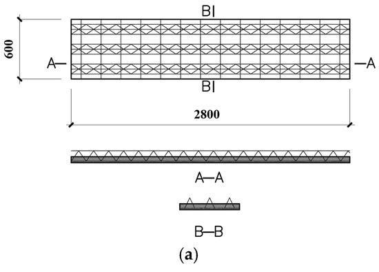 The top surface of the cast-in-place layer of each honeycomb combined flat beam specimen was reserved 35 mm from the top surface of the upper flange of the steel beam to meet the construction of floor and roofing materials, so as to make full use of the space and reduce the floor height. The concrete of composited plate and cast-in-place layer is C30 fine stone concrete with ribbed reinforcement of HRB400 of 6 mm diameter. The effective flange width of the intercepted composite beam is 940 mm, and the whole span is made up of three laminated plates, of which the width of the central laminated plate and the laminated plate at the two end supports are 1200 mm and 800 mm, respectively, and the truss reinforcement is arranged perpendicular to the steel beam. The laminated layer is 30 mm thick, and the cast-in-place layer is 40 mm thick.