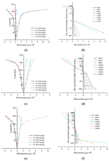 Five strain gauges were distributed symmetrically along the height at the solid web of the purely curved section of the beam to examine the strain distribution along the vertical direction of the beam section. The data of DTCB1 specimen 5 overflowed after 205 kN, DTCB4 specimen 4 was damaged after loading to 90 kN, and DTCB5 specimen 5 overflowed after 195 kN, and the overflowed or inaccurate data were discarded.