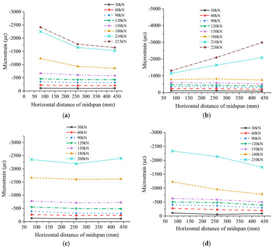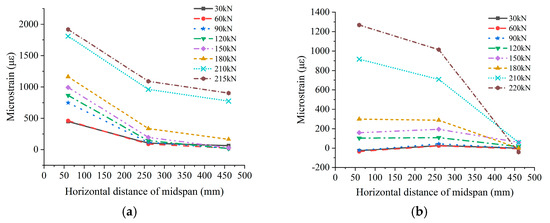 Three strain gauges were set in the span direction along the width of the upper surface of the concrete slab of the composite beam specimen, and the distances to the center line of the composite beam were 80 mm, 260 mm, and 440 mm, and the strains on the upper surface of the concrete flange slab in the span of the composite beam are shown in Figure 14 below. In the elastic stage, the compressive strain of the concrete flange plate is small and uniformly distributed, and there is no obvious stress reduction with the increase in the distance to the center line. When the specimen yielded, the stress in the compression zone of the concrete flange plate increased rapidly, and the longitudinal compressive strain along the width direction showed a more obvious shear hysteresis phenomenon, i.e., the internal force of the concrete flange plate was reduced due to the shear hysteresis, and the stress gradually decreased with the increase in the distance to the center line of the beam. Specimens DTCB1, DTCB3, DTCB4, and DTCB5 showed significantly higher compressive strains at the concrete near the central axis than at the concrete flange edge at the end of the test, and since the concrete slab of specimen DTCB4 was located more upward, the compressive strains on its concrete upper surface should be larger than those of the other specimens. Except for specimen DTCB2, the distribution trend of longitudinal strain on the upper surface of the concrete flange slab in the span of the other four combined beam specimens is the same along the beam width direction, and the strain varies little with distance, but the maximum value of compressive strain on the top surface of concrete flange slab increases with the increase in section height. The presence of honeycomb holes can strengthen the concrete connection on both sides of the web of the steel beam and strengthen the connection between concrete and steel beam, so that the combined flat beam specimen is less likely to have the damage phenomenon similar to the concrete and steel beam detachment in specimen DTCB2, but it does not have much effect on the distribution of concrete longitudinal compressive strain with the width direction. The compressive strain at the top surface of the concrete flange plate of specimen DTCB2 was more uniformly distributed in the early stage, and the concrete compressive strain showed a slightly decreasing trend with the increase in the distance to the center of the beam. However, at the later stage of loading, the rate of increase in concrete strain near the center decreased significantly due to cracks and slippage at the contact surface between the steel beam and concrete of specimen DTCB2, resulting in the edge concrete bearing more stress compared to the other specimens, and the longitudinal strain diagram at the top surface of its span concrete flange plate showed an upward trend at the later stage.