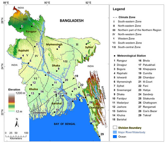 The seven subclimatic zones of Bangladesh were based on Rashid [49]. The division boundary shapefile of Bangladesh was acquired from the HDX (Humanitarian Data Exchange) of OCHA (United Nations Office for the Coordination of Humanitarian Affairs) [50], and the coordinates and attributes of the weather stations from BMD.
