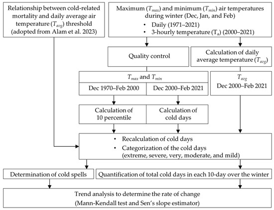 Here, the objective of this research is to implement the widely used percentile method (e.g., 10 percentile) to (i) determine the number of cold days and spells and (ii) perform their trend analyses using the Mann–Kendall (MK) test [42] and Sen’s slope estimator (SSE) [43], during the winter season in Bangladesh over the period 2000–2021.