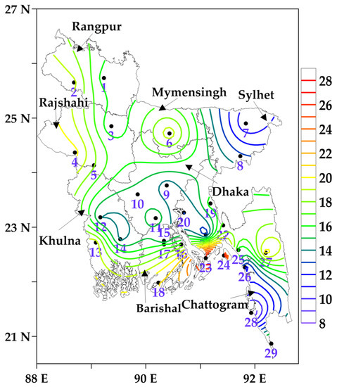 Spatial distribution of the primary estimation of average cold days across Bangladesh for the winters of 2000–2001 to 2020–2021 is shown in Figure 3. The highest numbers of cold days were found in the southeastern stations of Hatiya and Sandwip, with 28.24 and 27.71 days/year (d/yr), respectively. In contrast, the lowest numbers of cold days were observed in northeastern Sylhet (10.1 d/yr) and southeastern Cox’s Bazaar (7.76 d/yr) stations. In fact, higher numbers of cold days were exhibited at every station in the northern and northwestern parts of the country (i.e., Mymensingh, Rangpur, and Rajshahi divisions) in compared to the country average of ~16.51 d/yr, with the exception of the Rangpur (15.48 d/yr) and Bogura (15.19 d/yr) stations. In general, a higher number of cold days were seen in the southern, southwestern, and western stations of the country, and gradually decreased to the northeast and southeast.