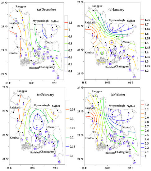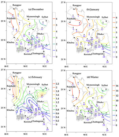 The final estimation of cold days across Bangladesh, using the Tthreshold of 17 °C in the winter months from 2000–2001 to 2020–2021, is shown in Figure 4a–d. The average number of cold days were reduced drastically in the southeastern and southern coastal stations in compared to the primary estimation (see Section 3.1) for the winter season (Figure 4d), including December (Figure 4a), January (Figure 4b), and February (Figure 4c). In contrast, when the Tthreshold value was used, not much effect was found in the western and northwestern regions. In general, the number of cold days in winter were higher in the northwest and west (Rangpur and Rajshahi divisions), and reduced gradually towards the northeast, east, south, and southeast of Bangladesh (Figure 4d). The highest average numbers of cold days were found in the districts of Rajshahi (6.05 d/yr) and Dinajpur (6.0 d/yr) in December (Figure 4a); Bogura (8.33 d/yr), Rajshahi (7.86 d/yr), Dinajpur (7.86 d/yr), and Ishwardi (7.48 d/yr) in January (Figure 4b); Dinajpur (2.19 d/yr) and Rajshahi (2.05 d/yr) in February (Figure 4c); and Dinajpur (16.05 d/yr), Rajshahi (15.95 d/yr), and Bogura (14.71 d/yr) in the whole winter season (Figure 4d). On the other hand, the lowest average numbers of cold days were noticed in Sylhet (5.14 d/yr), Chattogram (2.0 d/yr), Sandwip (4.86 d/yr), Teknaf (0.05 d/yr), and Cox’s Bazar (0.71 d/yr) stations. In the coastal regions, the average cold days ranged from 1–3, 1–5, 0.2–0.8, and 2–8 days/year in December, January, February, and the whole winter season, respectively. In addition, in the case of the entire country, the average numbers of cold days were 2.9, 5.2, 0.7, and 8.8 days/year in December, January, February, and the whole winter season, respectively. Overall, the highest and lowest numbers of cold days in the winter season were noted in January and February, respectively.