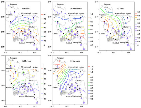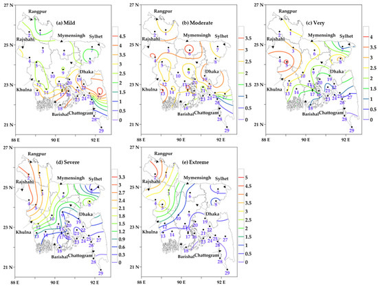 Figure 7a–e present five different categories of average cold spells from 2000-01 to 2020-21 winters. High values of the mild (Figure 7a) and moderate (Figure 7b) categories were mostly observed in the southern coastal stations. In contrast, high numbers of the very (Figure 7c) and severe (Figure 7d) categories were prominently found in the northeast, north and northwest, and west. Moreover, the highest average spells in the extreme (Figure 7e) category were noticed in the northwest, which gradually decreased towards the east, south, and southeastern regions. The extreme category was the highest in Rangpur (1.29 spells/year) and Rajshahi (1.0 spells/year) divisions, and the lowest in Barishal and Chattogram, with 0.19 spells/year.