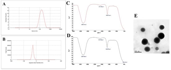 Characters of green-synthesized SeNPs using carvacrol. (A) Hydrodynamic diameter of green-synthesized SeNPs using carvacrol as determined by Zetasizer. (B) Zeta potential of green-synthesized SeNPs using carvacrol as assessed by Zetasizer. (C) FTIR spectra of carvacrol. (D) FTIR spectra of green-synthesized SeNPs using carvacrol. (E) TEM image of green-synthesized SeNPs using carvacrol.
