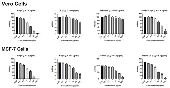 To assess the cytotoxic effects of SeNPs-CV against MCF-7 cells, CV, SeNPs, SeNPs-CV, and cisplatin (a chemotherapeutic drug used as a positive control) were used to treat the cells over a range of concentrations. Cell viability was significantly reduced in a dose-dependent manner in the treated groups in contrast to the vehicle group (0 µM; Figure 2). The IC50 values for CP, CV, SeNPs, and SeNPs-CV in MCF-7 cells were 1.9 µg/mL, 32.1 µg/mL, 41.6 µg/mL, and 8.3 µg/mL, respectively. According to these results, the cytotoxicity of the combination of SeNPs-CV in MCF-7 cells was higher than that of CV and SeNPs alone. Furthermore, the cytotoxicity of different compounds towards normal cells was determined using an MTT assay and the data are presented in Figure 2. The IC50 values for CP, CV, SeNPs, and SeNPs-CV in MCF-7 cells were 7.8 µg/mL, >1000 µg/mL, >1000 µg/mL, and 87.4 µg/mL, respectively.