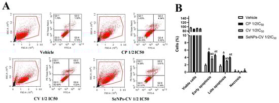 As seen in Figure 3, after 24 h, all treatment groups had a substantially greater percentage of early and late apoptotic cells than the vehicle group (p < 0.05). In contrast to the CV group, SeNPs-CV substantially enhanced the proportion of early and late apoptotic cells (p < 0.05). Moreover, there was no discernible distinction in the apoptotic impact between the SeNP-CV and CP groups.