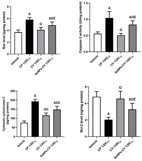 Consistent with these results, MCF-7 cells treated with CP or SeNPs-CV revealed significant increases (p < 0.05) in the levels of apoptotic markers (Bax, caspase-3, and cytochrome c) and a significant decrease (p < 0.05) in the levels of the anti-apoptotic protein Bcl-2 as compared to both the CV and vehicle groups (p < 0.05). Meanwhile, administration of CV alone increased cytochrome c levels notably as compared to the vehicle group (p < 0.05; Figure 4).