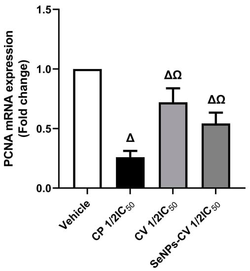 Cisplatin (CP), carvacrol (CV), or green-synthesized SeNPs (SeNPs-CV) suppressed MCF-7 cell proliferation detected by measuring the mRNA expression rate of proliferating cell nuclear antigen (PCNA). Values represent the mean of three experiments ± standard deviation (SD). Δ denotes significance with respect to the untreated control cells (p < 0.05). Ω denotes significance with respect to the CP-treated cells (p < 0.05).