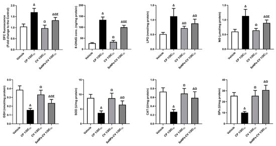 ROS production and antioxidant exhaustion are fundamental mechanisms underlying the apoptotic impact of anticancer medicines on tumor cells. Therefore, 8-OHDG, NO, ROS, and LPO levels were evaluated as oxidant biomarkers, whereas GSH levels and antioxidant enzymes’ (SOD, CAT, and GPx) activities were determined as antioxidant biomarkers. As shown in Figure 6, considerable rises were observed in 8-OHDG, ROS, NO, and LPO, paralleled by a significant drop in GSH level and antioxidant enzymes activity in the CP and SeNPs-CV groups compared with the vehicle group (p < 0.05). However, LPO levels were significantly higher in the CV group than in the vehicle group (p < 0.05). Meanwhile, compared to CP-treated cells, cells treated with CV displayed markedly (p < 0.05) higher levels of antioxidants and lower levels of oxidative stress markers. Overall, the oxidative effect of SeNPs-CV was stronger in MCF-7 cells than that of CV alone.