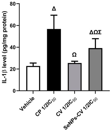 The levels of IL-1β were evaluated to assess the effect of SeNPs-CV on the inflammatory cascade in MCF-7 cells. A marked increase (p < 0.05) was noted in the inflammatory marker IL-1β in cells subjected to CP and SeNPs-CV compared to the vehicle group. Furthermore, MCF-7 cells treated with SeNPs-CV showed notable increases (p < 0.05) in IL-1β levels as compared to the CV group (Figure 7).