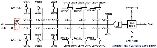 The proposed SAR ADC architecture is depicted in Figure 3. During the sampling phase, the high-linearity bootstrap switch [8] is enabled to sample the input signal and store it in the CDAC. The design employs the top plate sampling technique, which means that the sampling signal Vin is directly connected to the input of the comparator. In the sampling phase, the bottom plate voltage of the CDAC is linked to VREF1, VREF2, VREF3, and VREF4 through an inverter and MUX, with VREF1 equaling 2 times VREF2, 4 times VREF3, and 8 times VREF4. After the sampling phase, the SAR ADC enters the successive approximation (SA) phase, during which the dynamic comparator begins to operate. The SAR logic adjusts the control signals SWP<i> and SWN<i> of the CDAC based on the comparator’s output and generates the SAR ADC output result Dout. In the SA phase, the bottom plate of the CDAC is sequentially and monotonically switched to VREFN.